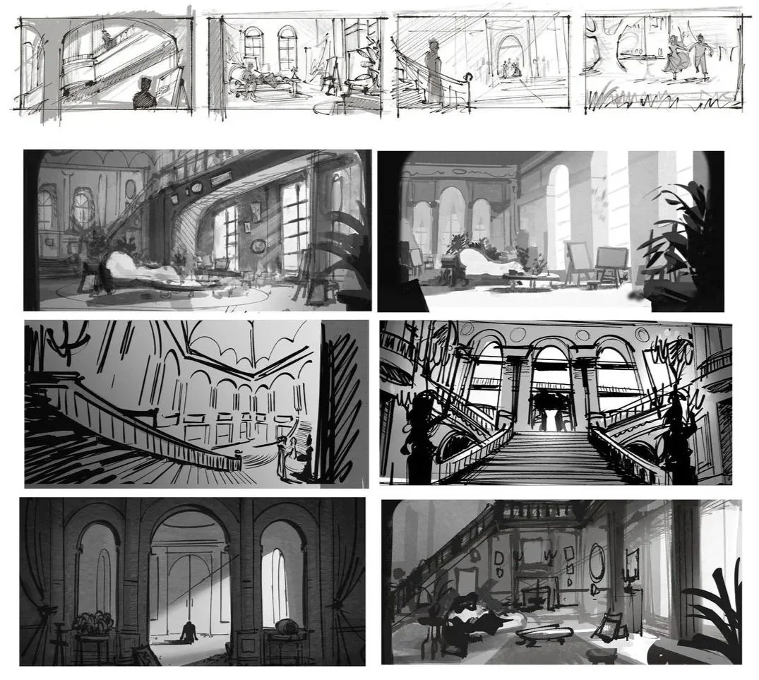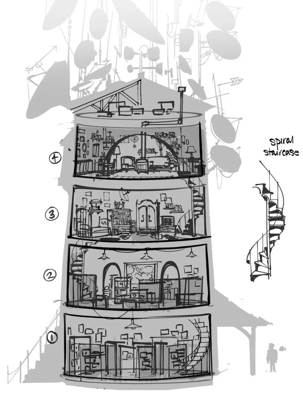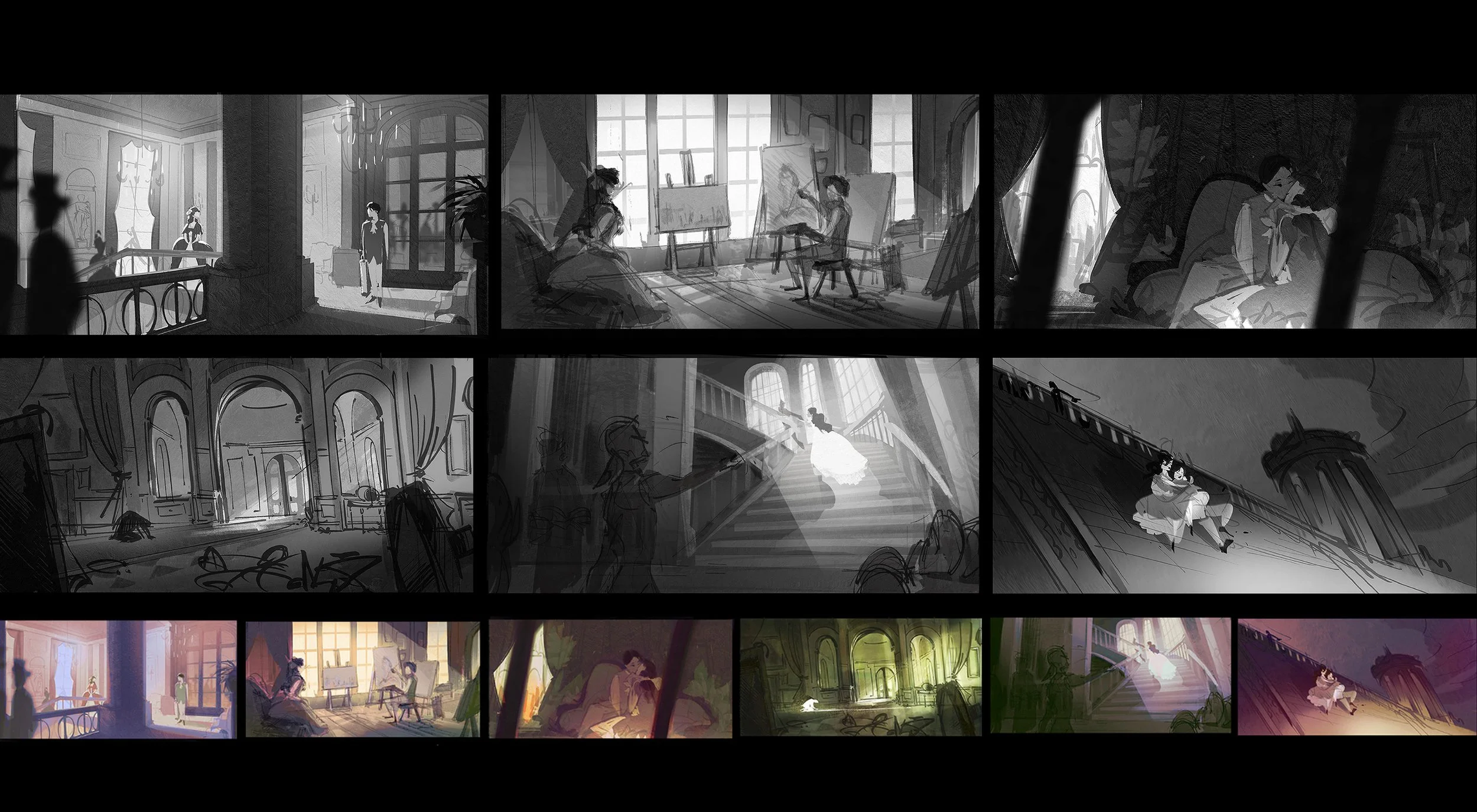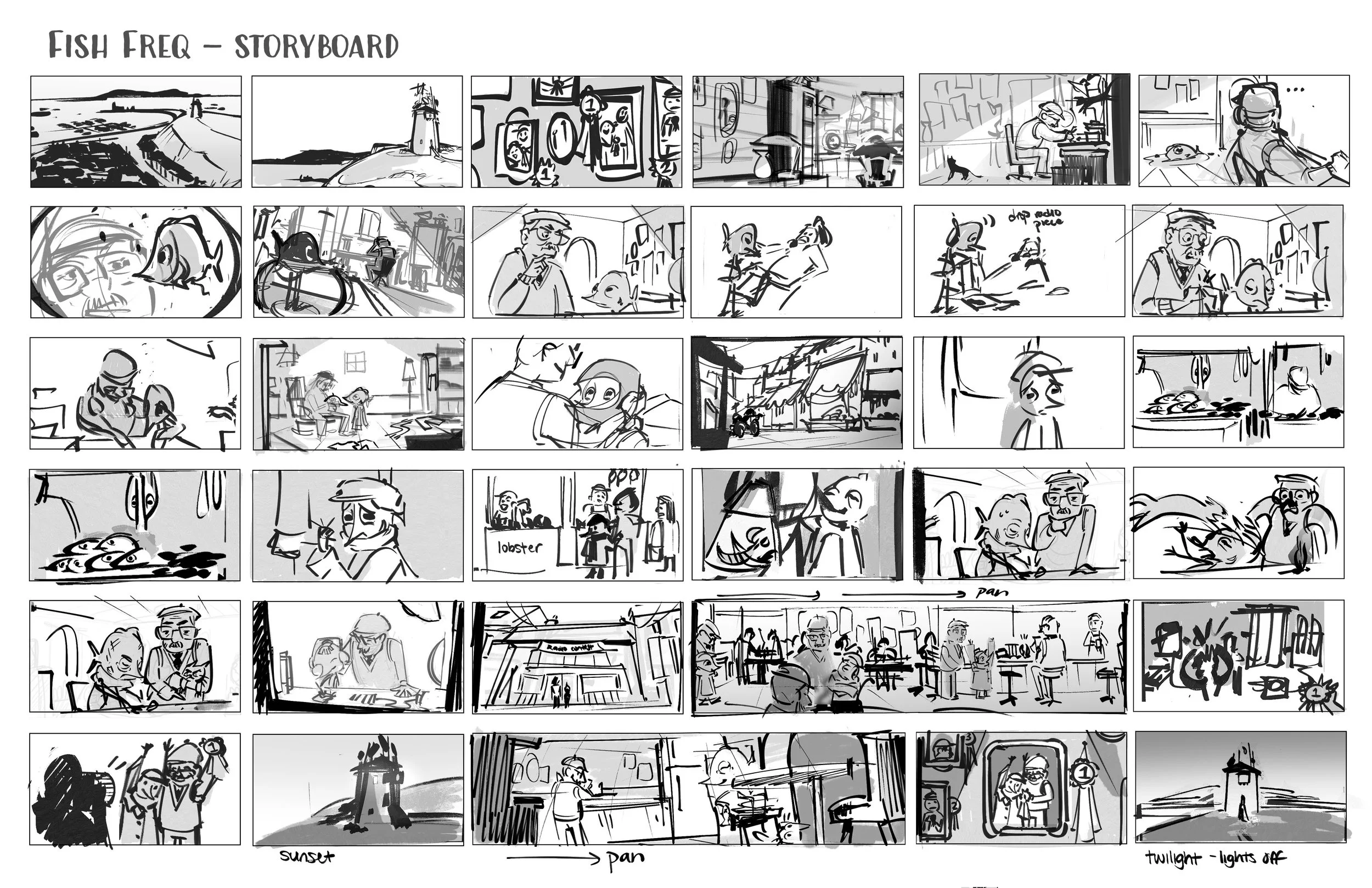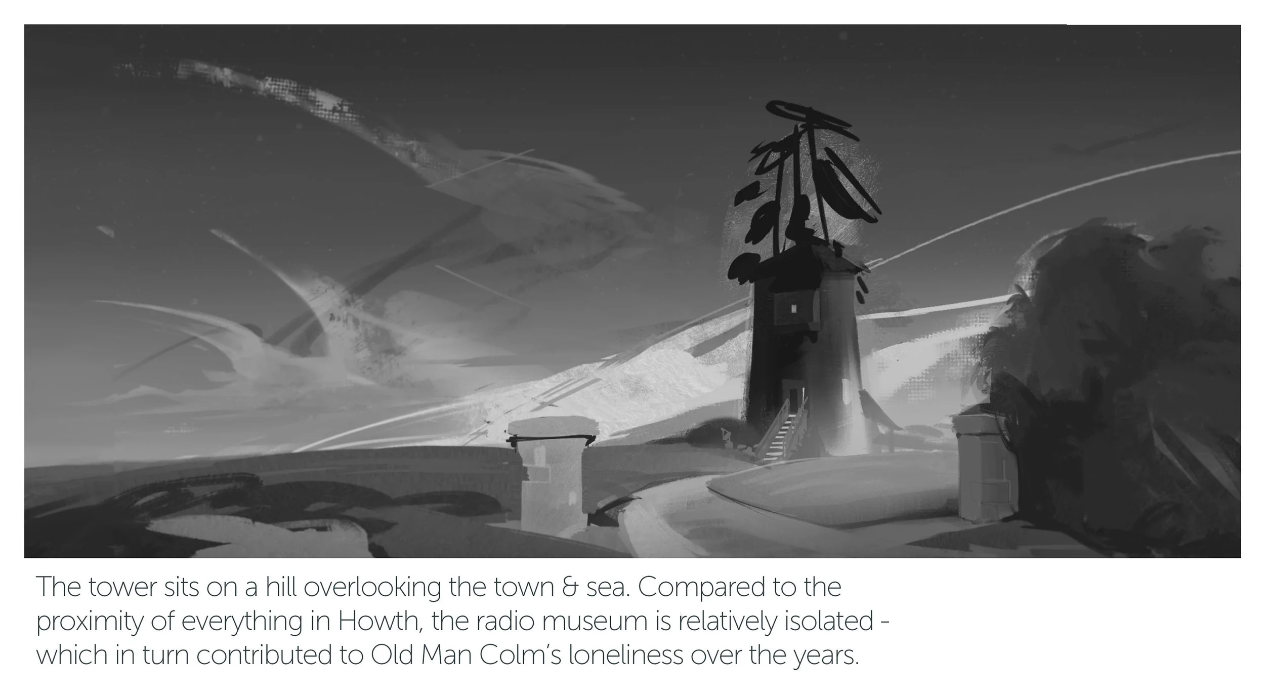 The coastal town goes through 3 different color stages throughout the story, starting with cool, desaturated blues and ending with warm, yellow and greens.