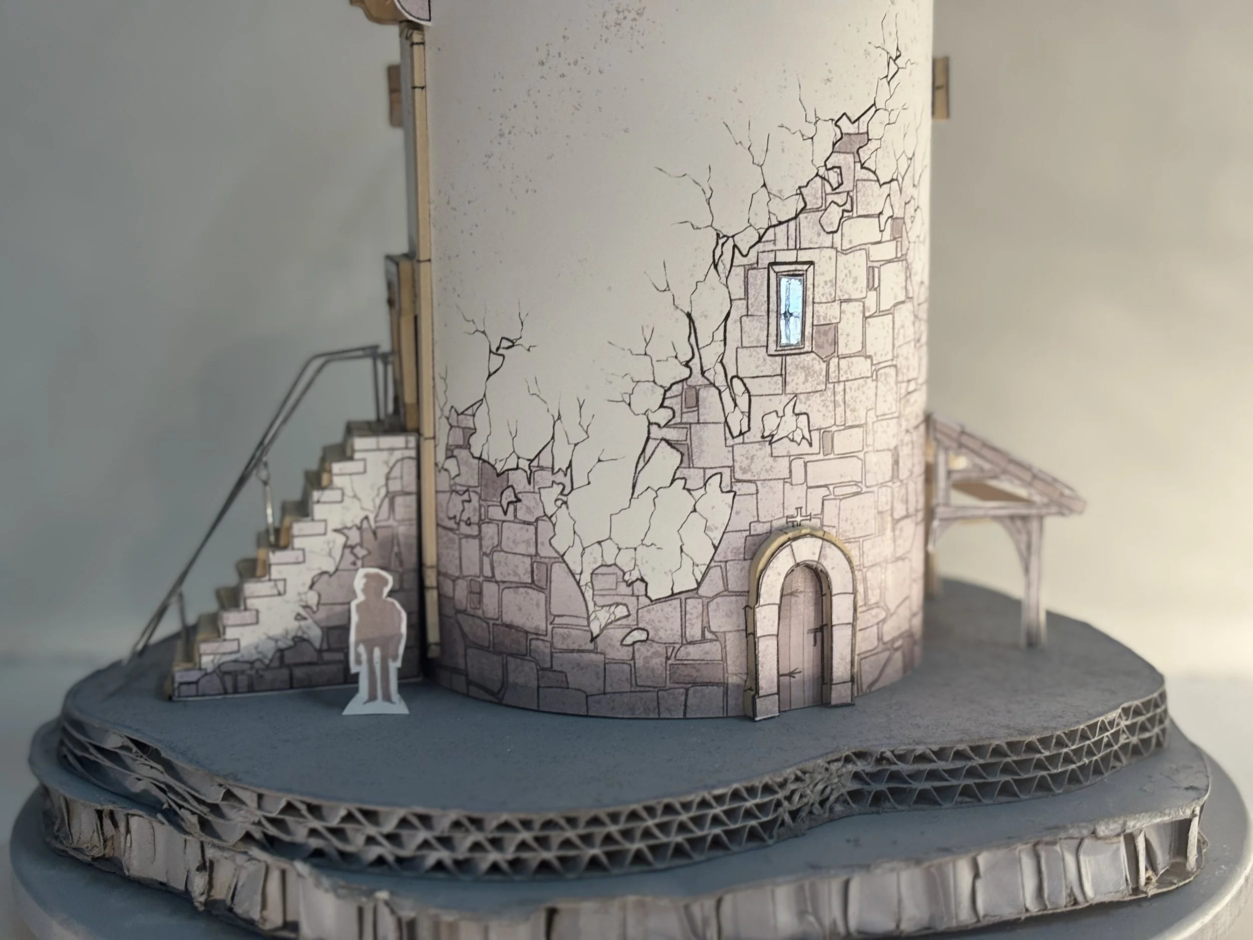 Model of the radio museum tower, built using cardstock paper, balsa wood, steel wire, and plastic tubing.